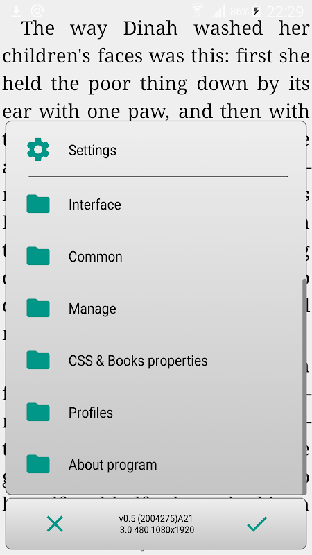 You can use external dictionary for translate words and sentences. You have the opportunity to correct typos in fb2 and txt files. The application can arrange hyphenation in 20 languages. Day / night profiles are available for comfortable reading at any time of the day. Custom font settings. Custom color settings. One- and two-page mode with automatic switch to the two-page mode in landscape. OpenGL paging animation. Autoscroll "wave". Navigation in the text: by percents, by pages, to the beginning/end of the text, to the next/previous chapter. 9 tap-zones for short and long taps, gestures, gestures with two fingers, resize text by "pinch", to assign the actions for buttons.Clock behind the text. Ability to hold screen backlight (up to 10 minutes of inactivity). Synchronize reading position via network or file system.