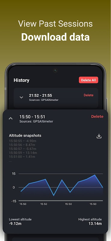 Altitude Finder is a powerful altimeter and barometer app that tracks your elevation, speed, and movement over time. Whether you're scaling mountains or exploring the outdoors, you can record sessions, view them on a graph, and see your route on the map.