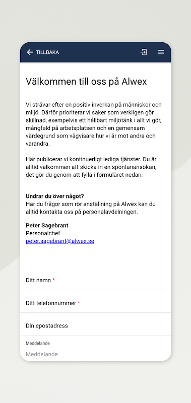 The Alwex app is for you who are an employee or external user. As an employee, you get easy access to documents and checklists regarding your employment, you can follow the news flow from the management or make your own post. You also get easy access to contact registers, stamping clock and support for our various IT systems. As an external user, you can, among other things, count on and order products from our range, see vacancies and apply directly in the app and get access to contact registers.