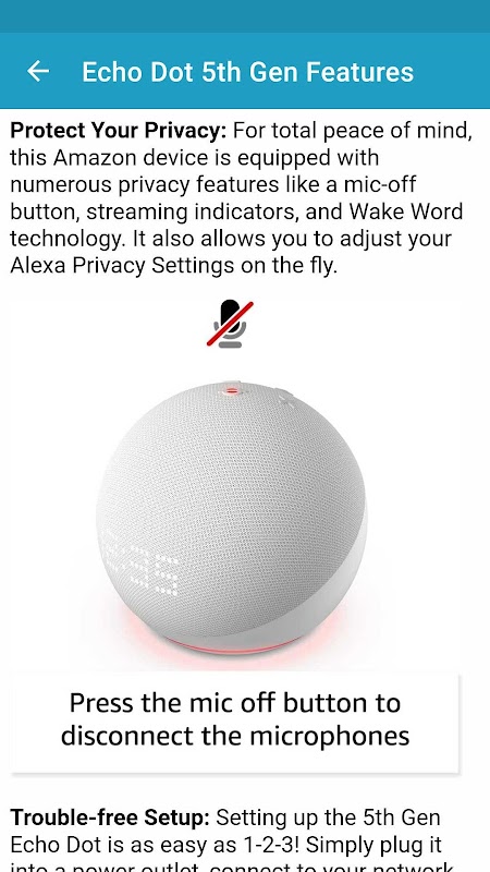 The mobile app explains Amazon Echo Dot 5th gen features, HOW TO SETUP, and technical specifications. The Amazon Echo Dot 5th generation model features convenient touch gestures, a more balanced sound, built-in eero mesh, alexa capabilities, and a room temperature sensor.
