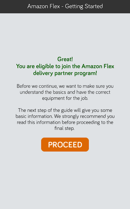 The guide starts with simple yes/no questions to check if you will be able to sign up to the Amazon Flex program. If you are, you will next be able to read everything you need to know about delivering for Amazon Flex before being helped downloading the delivery app. Happy delivering.