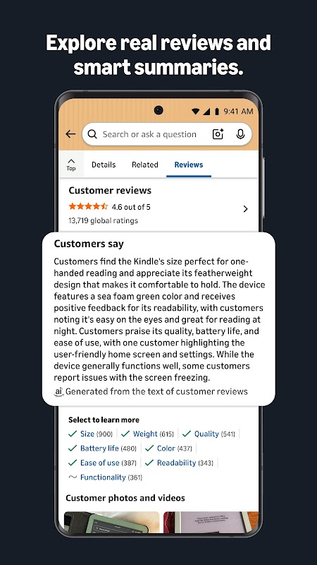 360° images let you rotate products for a complete look, while “View in Your Room” places select items in your space using AR. This helps answer practical questions such as whether a lamp fits a small side table or a bookshelf clears a low ceiling. The Amazon Shopping app makes these tools easy to reach from the product page, which builds confidence before adding to cart.