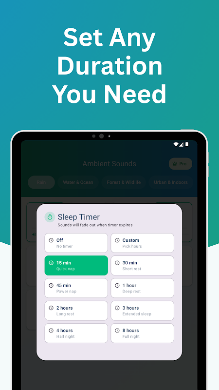 • Relaxing sound library: Rain, Water & Ocean, Forest & Wildlife, Urban & Indoors