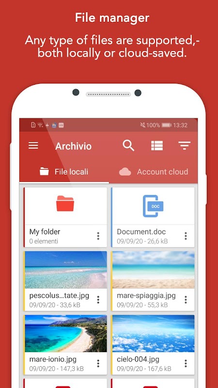 - Powerful file manager with multiple layout (grid, list) and sort features.