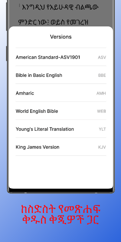 amharic bible app offline with six (6) versions , KJV , YLT , ASV , WEB , BBE .