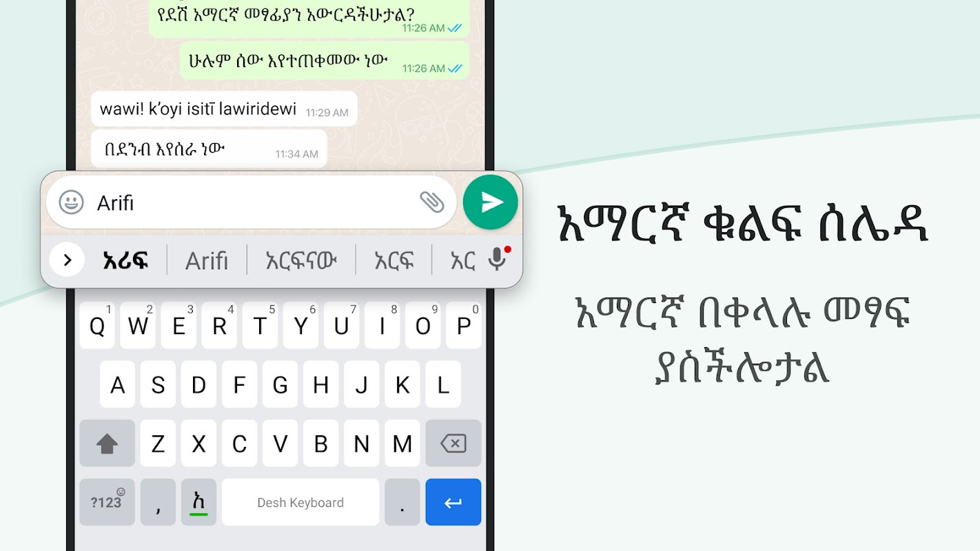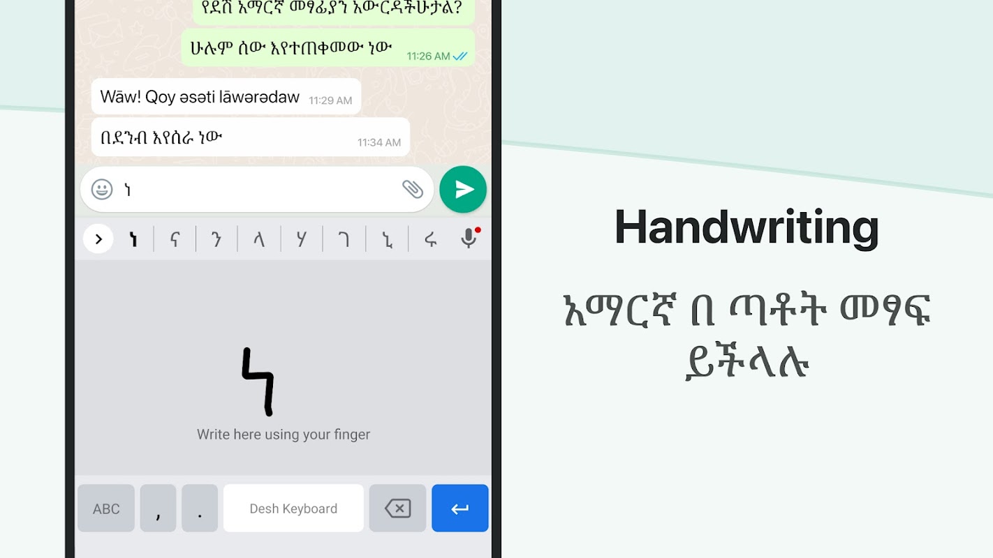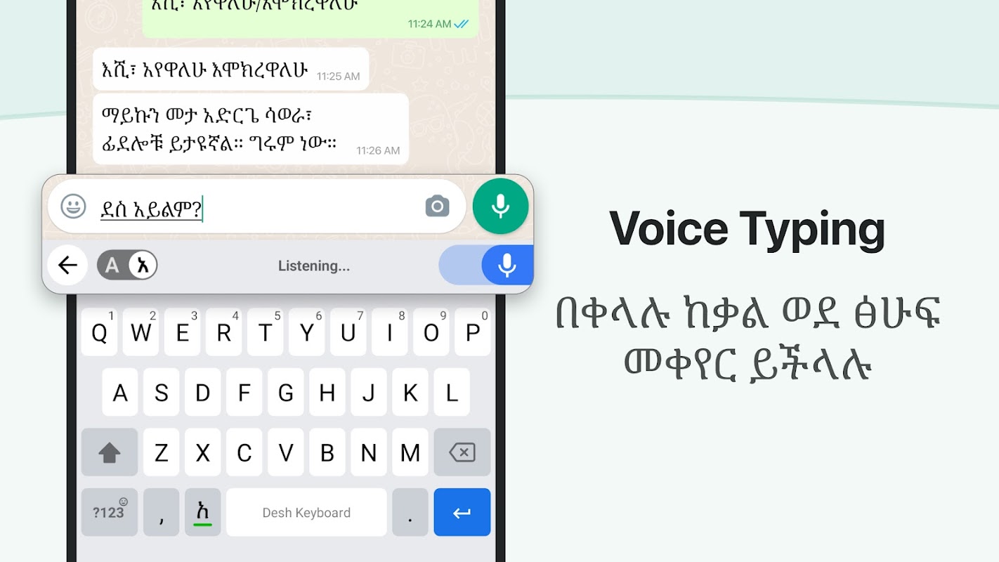 Chat with your friends and family in your native language - use native Amharic text on any chatting or social media apps on your phone like a regular keyboard.