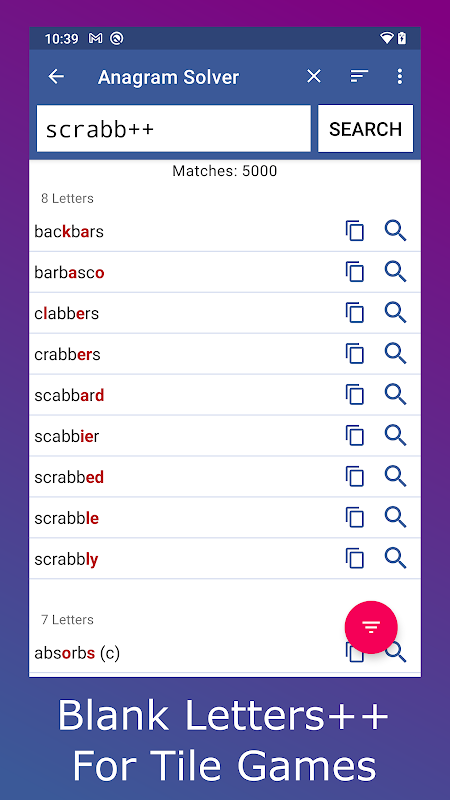 Narrow down your results using filters, you can allow words that start with, end with, contain or exclude certain letters. A powerful feature when you need to find words that fit with other tiles on the game board.