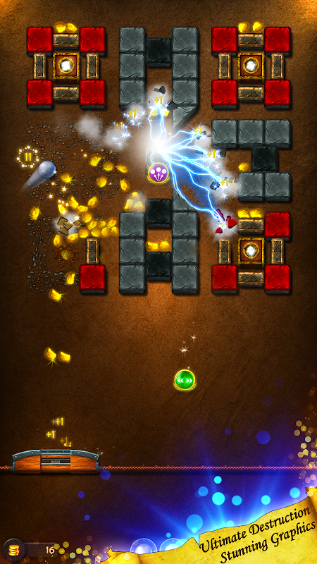 Exploration: you can discover 6 different labyrinths containing 240 unique chambers and 192 mysterious tombs. You must break all bricks in a chamber to complete the level. Use the paddle to collect the falling treasurers and power-ups. Be careful, though, as not all power-ups are handy!