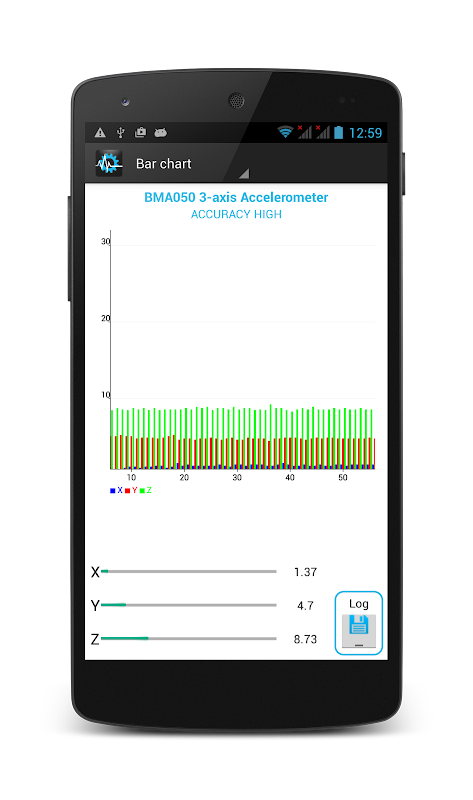 - Graphs: You may choose how you want values to be displayed, via real-time charts or the good-old text layout. You may switch between graph and text output for each sensor by tapping on the sensor image on the left side. Sensors that have available graphs are distinct by the icon in the top left of the sensor specific section. Graphs are not available for Location and Proximity.