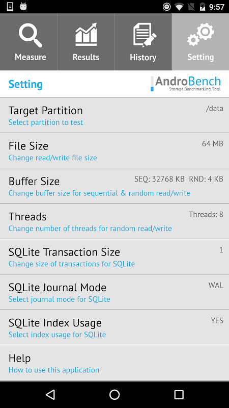 AndroBench is a benchmark application which measures the storage performance of your Android devices. AndroBench provides two kinds of benchmarks: Micro and SQLite. With the Micro benchmark, you can quickly compare the base performance of your storage device with those of other devices. The SQLite benchmark tests the performance of insert, update, and delete queries on a database table that mimics the one used in a messaging app. To obtain correct results, please minimize background activities while you run AndroBench. AndroBench is available for free and without any advertisement, and thus feel free to use it.