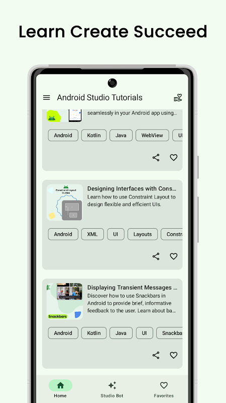 This app provides clear, concise tutorials with practical examples in Kotlin and XML. You'll learn fundamental concepts and best practices for building Android apps. Copy the provided code snippets and use them as building blocks for your own projects.