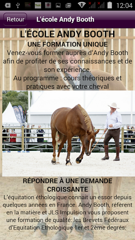 L'application "Andy Booth" vous offre la possibilité de consulter toutes les infos utiles de l'éleveur de chevaux (Tarifs, prestations, avis…) mais aussi de recevoir leurs dernières News ou Flyers sous forme de notifications Push.