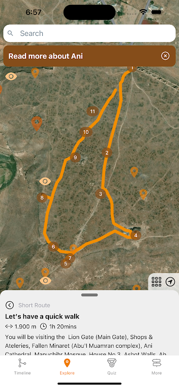 The app presents information about 45 structures in the city of Ani and its surrounding in three languages while categorizing the info such as history, architecture, art history, and architectural preservation. Four main routes based on the locations of different structures allow the users to visit and experience the Ani Archaeological Site on specific themes.