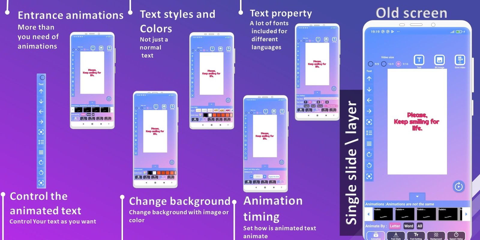 Animated Text app where you can overlay colorful background with text animation. You can change the background color with color wheel easily, and you can change it with your own images or picture, the exportation of the video is in different resolutions and fast generation process.