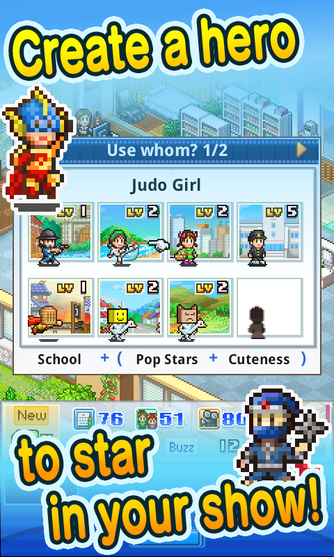 Select a face, body, and presto! Your completed hero can then explode onto the scene of your show, wowing watchers to rule the rankings! Categories include "Dateability," "Popular with Kids," and more! As the animaestro, only you can bring status to your studio!
