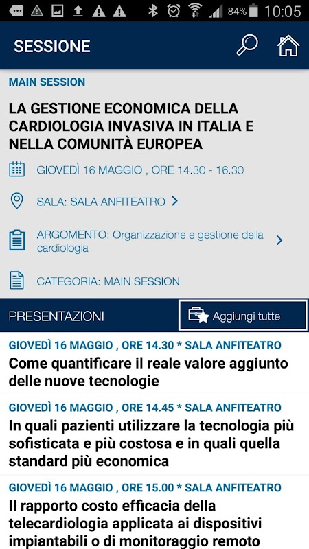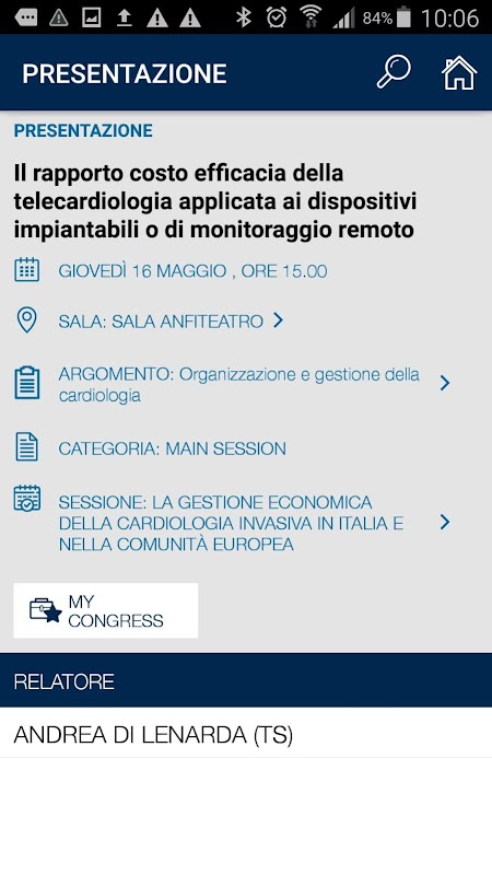 La funzionalità My Congress permette di salvare l’orario e la sala in cui si terranno le Presentazioni di proprio interesse.