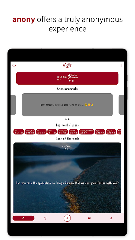 anony is your ultimate destination for a truly anonymous experience, allowing you to vent and express yourself freely. Connect with a fun, uplifting, positive, and understanding community from around the world, and lift your mood by sharing your feelings without any fear of judgment.