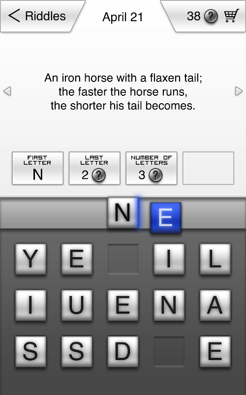 If you get stuck, the hint system will help you. Get the first letter of the solution (1 point); the last letter (2 points); the number of letters (3 points); and after these the solution (4 points). You start with 40 points, get 2 more for every riddle solved, and you can also purchase more points.
