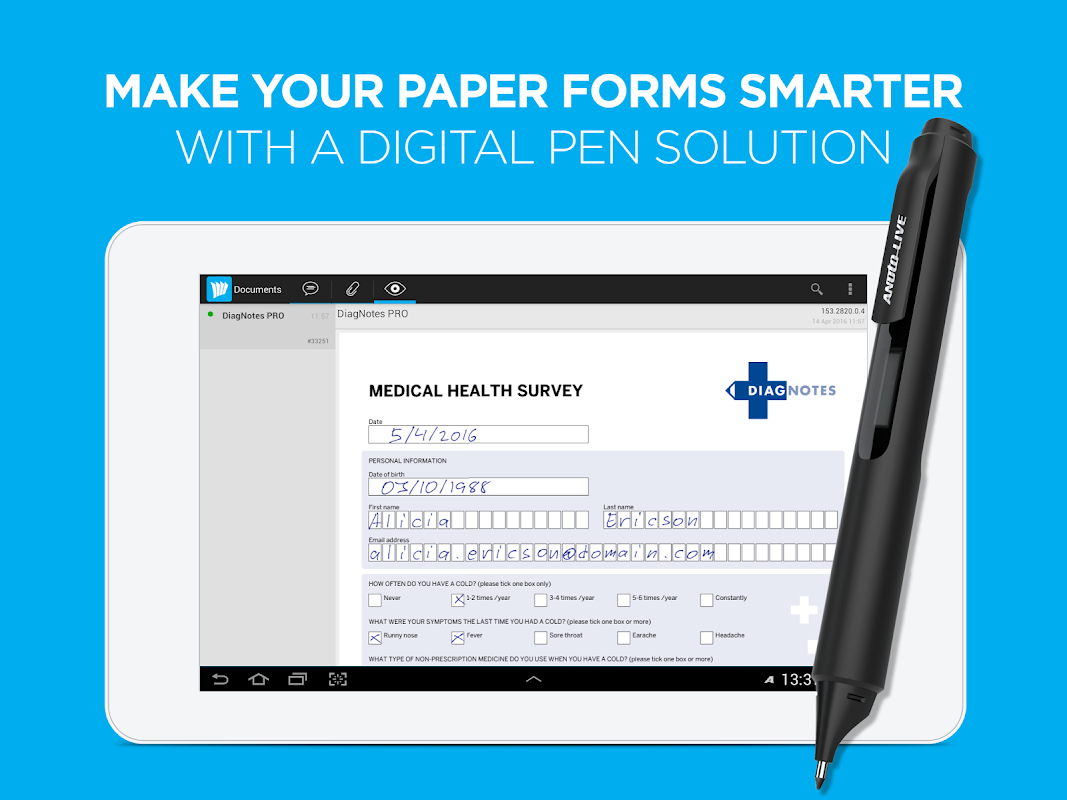 Anoto Live™ Forms for Android which, when licensed in conjunction with Anoto Live Forms Server, creates a powerful, easy-to use forms processing app that helps you capture your forms data faster than ever.