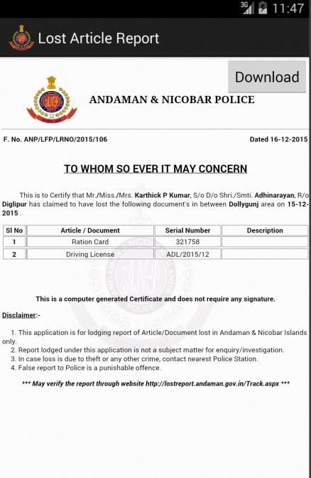 Mobile app for Lost Article Report with Andaman & Nicobar Police