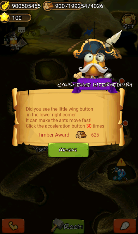 Use the collected resources to upgrade rooms and get more ants to speed up your productivity.