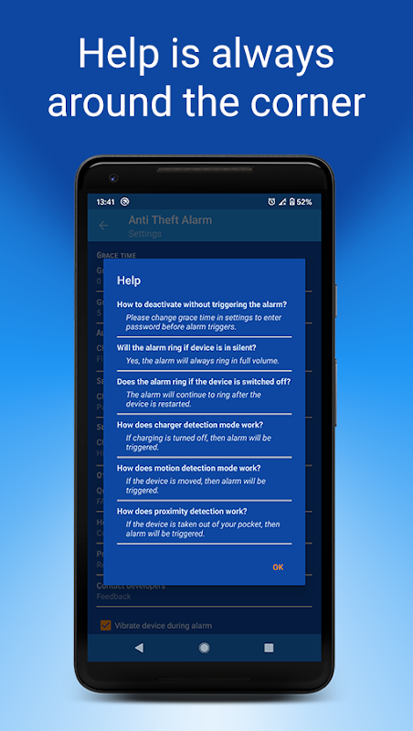 Anti-theft alarm makes your device inoperable to the thief even after he restarts the phone or kills the app. The alarm continues to ring until the right password is entered.