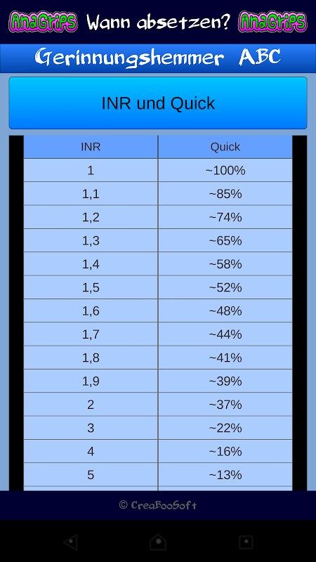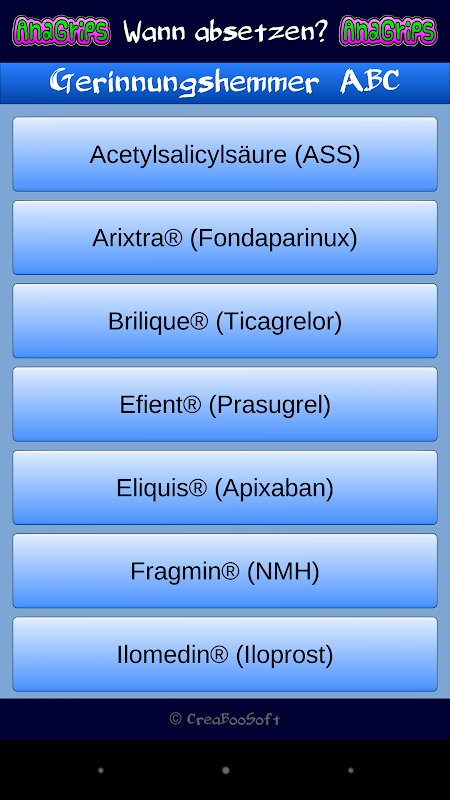 This application is not meant to be scientific work. You should only present contents of the subject. The information contained in this application is based on the recommendation of the German Society for 3.überarbeitete Anesthesiology and Intensive Care (DGAI) on "neuraxial anesthesia and thromboembolism / undertreatment medication (class S1) (http://www.awmf.org/leitlinien /detail/ll/001-005.html). All information is subject to the accuracy or completeness. The use of this application is at your own risk. decisions in clinical setting should be based on an individual and possibly interdisciplinary risk-benefit analysis. suggestions or criticism I take gladly. Use the Review button!