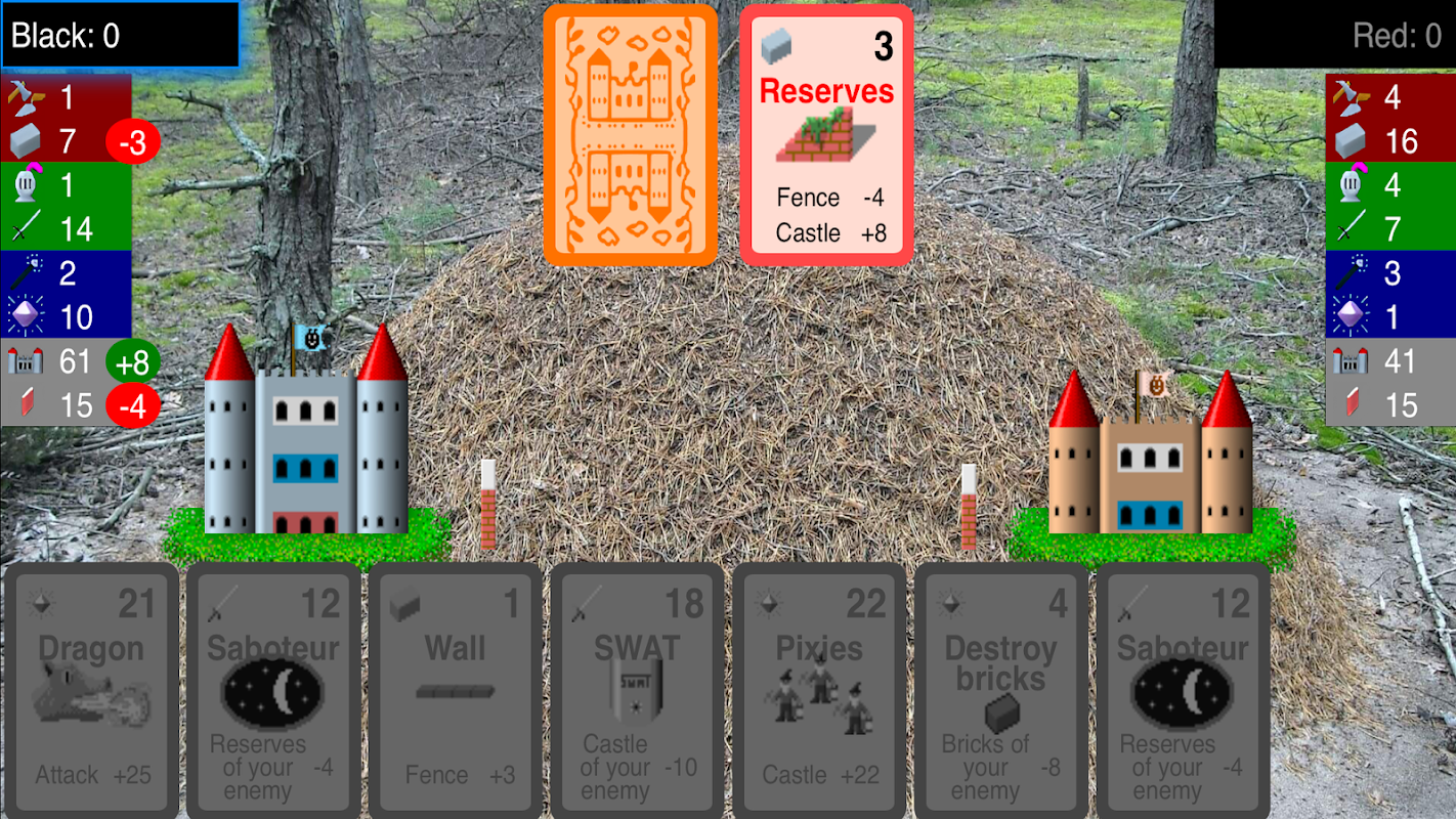 The goal of the game is to build 100-height castle or to destroy enemy castle. Tap to card to play it, swipe up the card to discard it. Every card needs certain quantity of raw materials. Speed of its generation depends on team quantity.