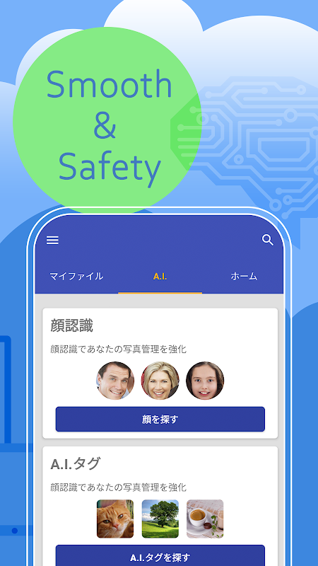 ● AI face recognition: Face recognition in backed up photos using AI function. You can create custom thumbnails to display the same person together.