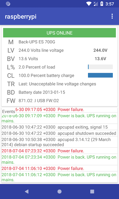 This is a simple, free and also ad free APCUPSD monitor application which can be used via SSH or NIS to pull information from your APCUPSD instances or from Eaton UPSes via using Eaton IPM software and its https web interface. I have developed this app for my own use with features I need so future features are up to users to ask. My personal usage for this is to monitor power outage logs easily.