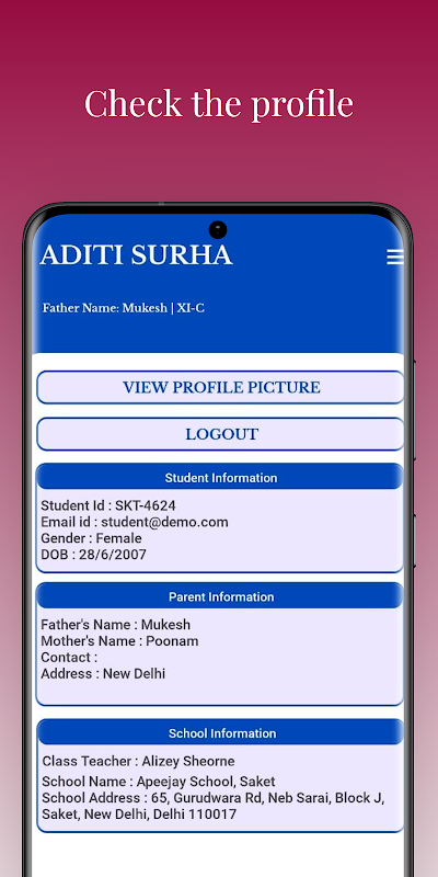 This app enables parents to seamlessly view their student's details, such as grades, attendance records, assignments, and important school announcements, all in one centralized platform. With real-time updates and easy-to-navigate interfaces, parents can stay actively engaged in their child's educational journey, fostering a stronger connection between home and school. This app not only enhances transparency but also empowers parents to actively support their child's academic progress, ensuring a well-rounded and successful educational experience.