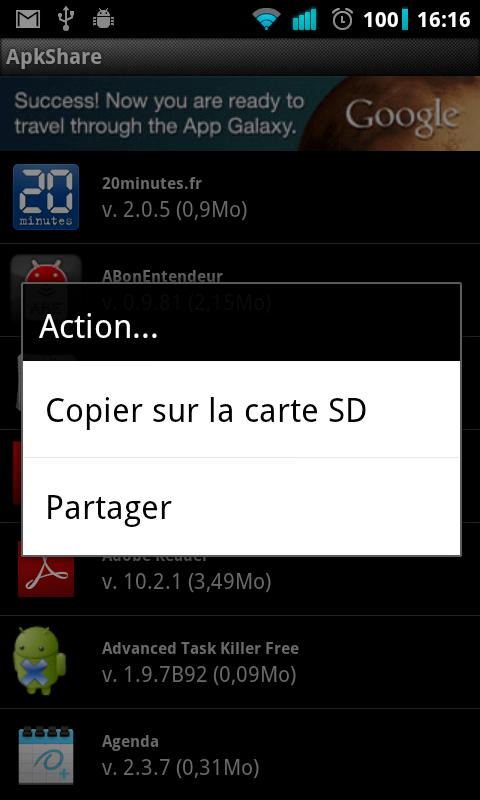 Easy app share. ApkShare allows you to copy or backup your applications to your SD card or to send it to a friend !