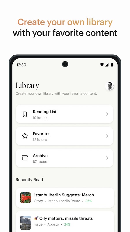 Library: Create your own reading lists in the Library to revisit your favorite issues or read them later.