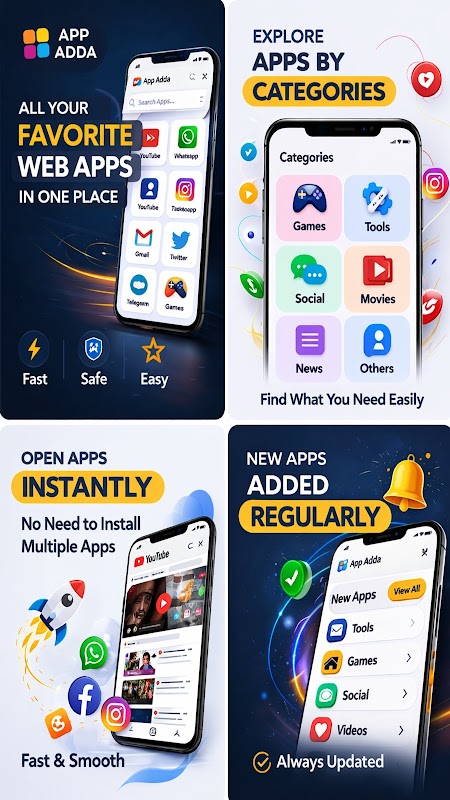 App Adda is a versatile application that consolidates a curated collection of various web applications, New categories and applications are added periodically without the need to redownload the app.