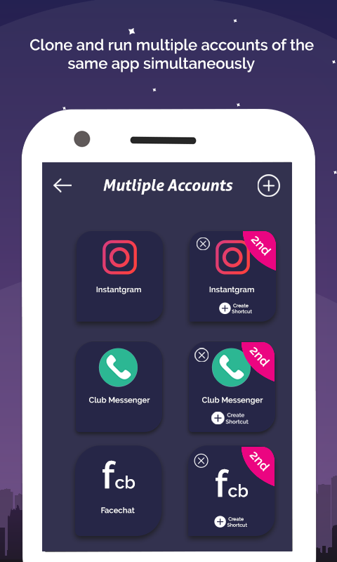 This app is useful to create clones of apps like facebook, twitter, whatsapp, or other social apps. You can create new accounts for cloned app.