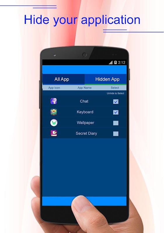 App Icon Hider is a launcher which will hide your apps from the phone menu. It will not uninstall the app but it actually hide your app and no one other than you can access it. Hide your apps from your nosy friends and children with the powerful security access. You just need to tick on the apps icon which you need to be hide and it is done. When you want to add it on the phone menu back just untick it.