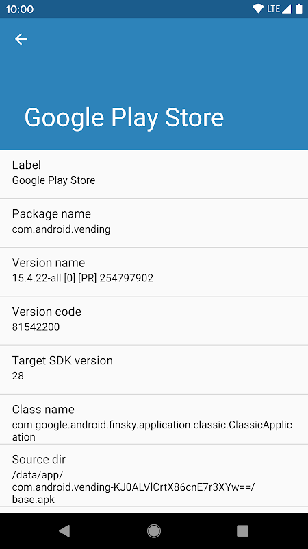 Inspect the detailed properties of all apps installed on your device. Those properties are available to Android's internal PackageManager, usually many of them are not exposed by system's default user interface (such as Version code, Target SDK Version, etc).