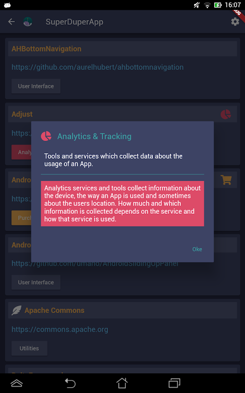 See which services and libraries are used by the Apps on your device. App Inspector scans installed Apps and can detect more than 1,400 services, SDK's and libraries. It highlights items with privacy implications or other issues like ad networks, analytics platforms and push notifications.