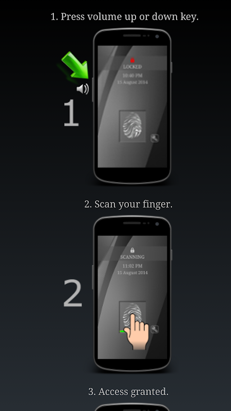 1. Press volume key and touch the fingerprint pad (you will be granted access to the app list).