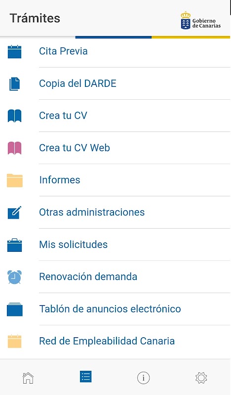 The application allows the realization of numerous electronic procedures such as the Renewal of the Demand for Employment, Obtaining Reports, the request for Prior Appointment for the attention in the offices of the Canary Islands Employment Service and the consultation of training courses and job offers, as well as make the registration in them. To carry out these procedures it is necessary to have the DARDE characters associated with the demand for employment.