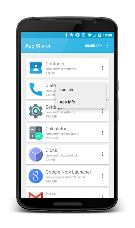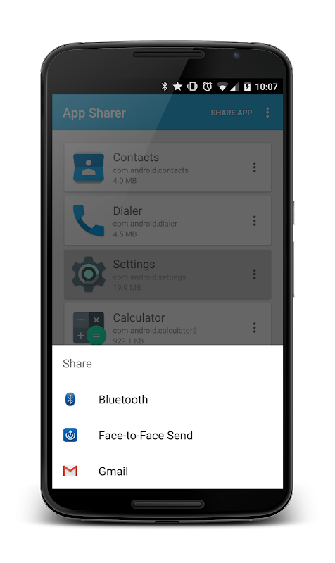 App Sharer is a light-weight tool simply designed to share your applications with other users. The application quickly lists all the installed applications on the user's device, displaying information about each application allowing the users to choose whether to un-install, backup or read detailed information about each application.