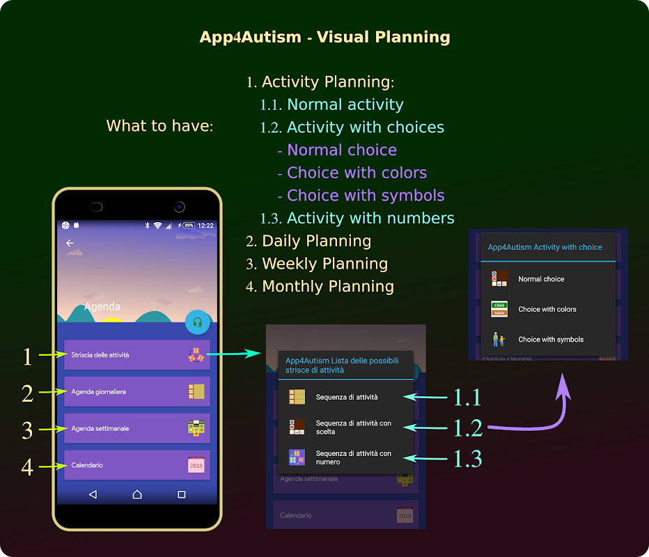 Visual Planning is a concrete and visual agenda of the sequence of activities which will take place over time to increase the predictability and reduce the uncertainty. It is possible to define a sequence of activities during a limited period of the day, for example during the session of speech therapy (namely Activity Planning), during the day (Daily Activity), during the week (Weekly Planning), or to remark important events in the month (Monthly Planning). The Visual Planning is a customizable and easy-to-use tool, allow users to edit any element very quickly, clearly and structurally.