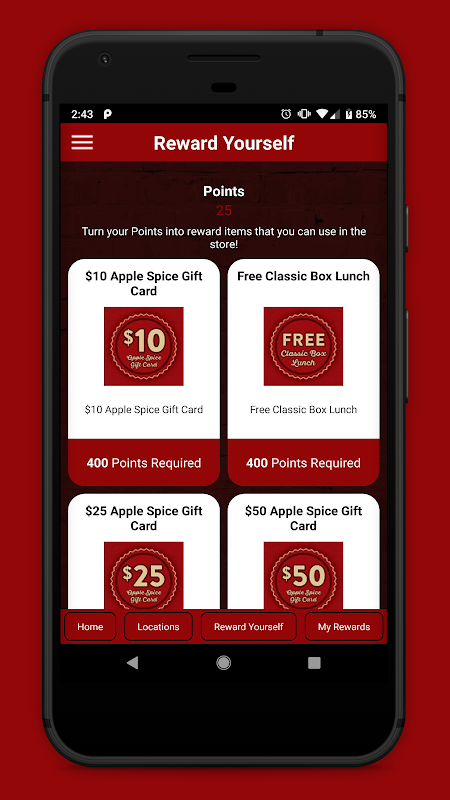 Redeem points for free meals, Apple Spice gift cards, & Amazon gift cards.