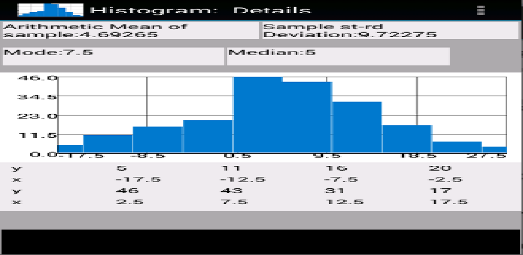The app is designed to store (edited, deleted, renamed) a lot samples of random variables, to calculate their basic statistical characteristics as the: -average value; - standard deviation; - skewness and kurtosis; - variance and standard deviation; - determined histogram of sample.