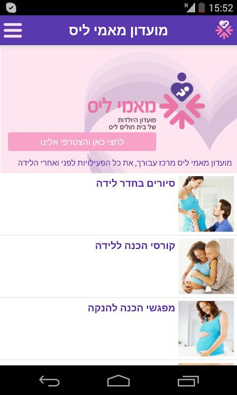 תוכלי גם ליצור קשר עם מועדון היולדות שלנו "מאמי ליס" ולהיעזר בו לכל שאלה שתתעורר, לבחור את הקורס המתאים לך ביותר לקראת הלידה, לראות מתי מתקיימים סיורים ולהירשם. האפליקציה מותאמת לך אישית, כך שבכל רגע נתון תוכלי לסדר את שולחן העבודה של האפליקציה בהתאם לשלב ההריון ולפיצ'רים שמעניינים אותך, ותמיד תוכלי להיות מעודכנת ולשתף במידע את מי שתרצי. יחד איתך בחוויה שלך! ועכשיו גם בסלולר.