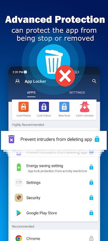 - Protection against deletion or removal: App Lock provides this feature in order to prevent others or intruders from deleting the application.