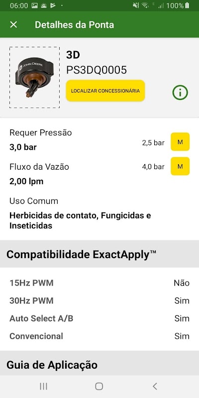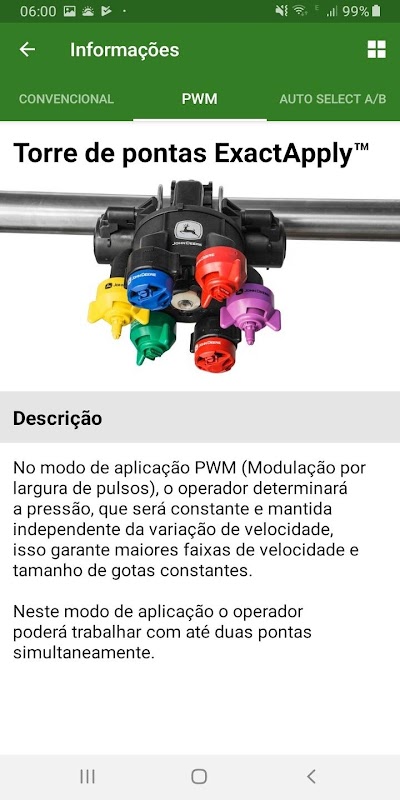 Download the ApplyPlus ™ LA application and you will be able to select spray tips for conventional sprayers with ExactApply ™ technology (PMW and Auto Select A / B). Understand and differentiate all its features like Auto Selection, Pulse 15Hz and 30Hz or even conventional!