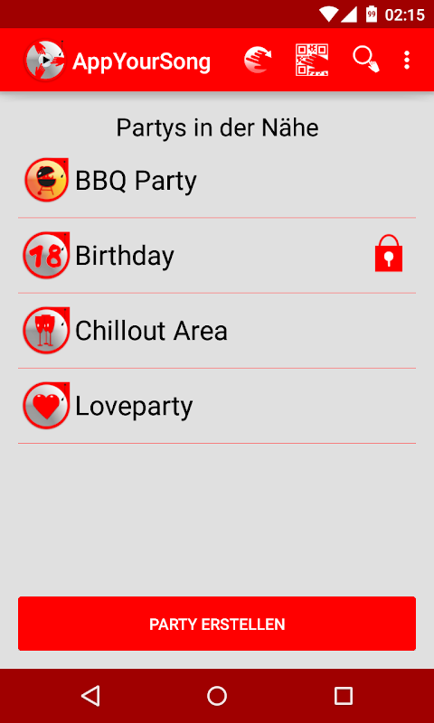 AppYourSong automatically shows you all parties in your surroundings. As a guest just select your party and you can start. You can also search manually for the party name or ask your host to use the app to generate a QR-code to the party. This QR-code also encodes the password, if it is a secured party. If you choose a secured party manually, ask your host for the password. Guests can alter their requested songs in the wish list as long as a song is not played yet.