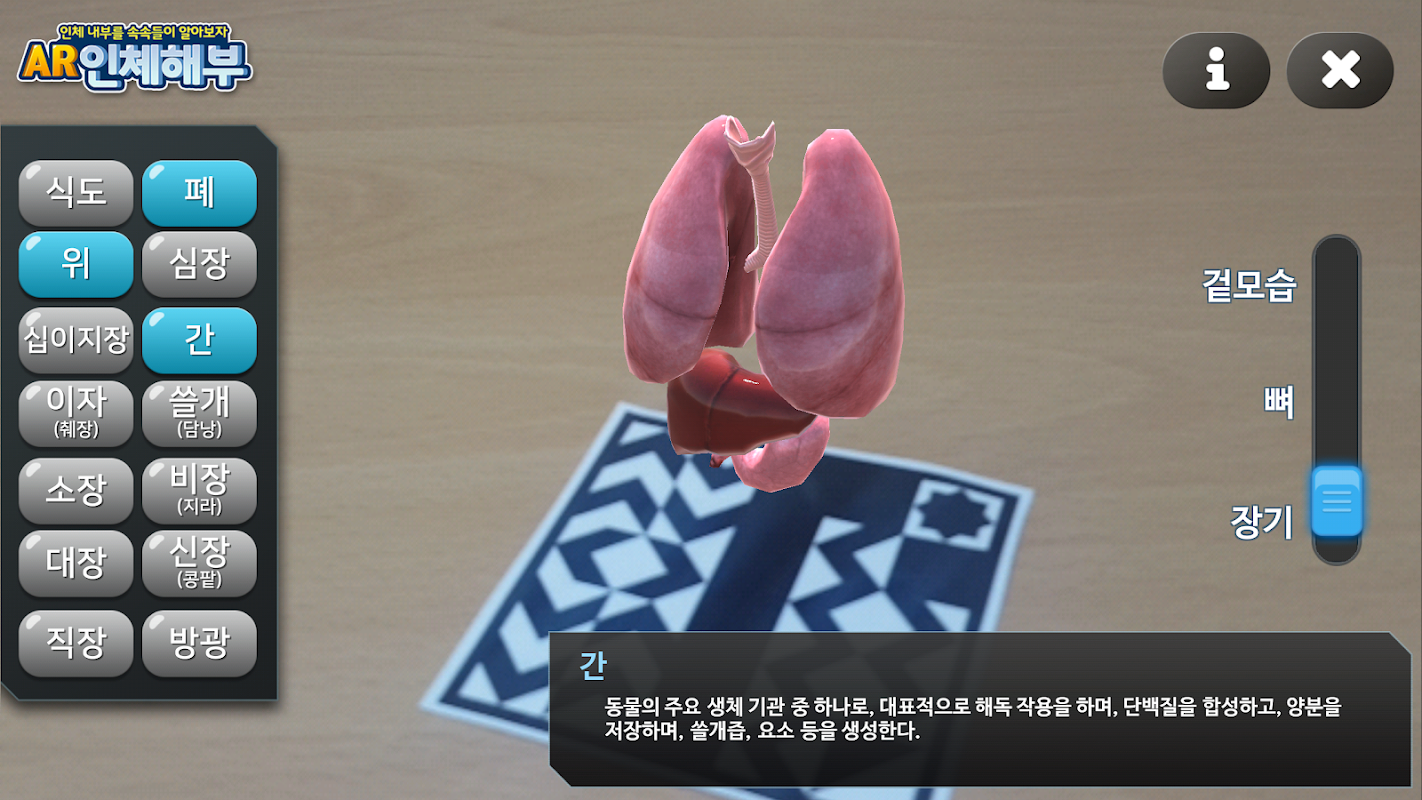 인체의 겉모습, 뼈, 주요 장기를 AR콘텐츠로 관찰해 볼 수 있습니다.