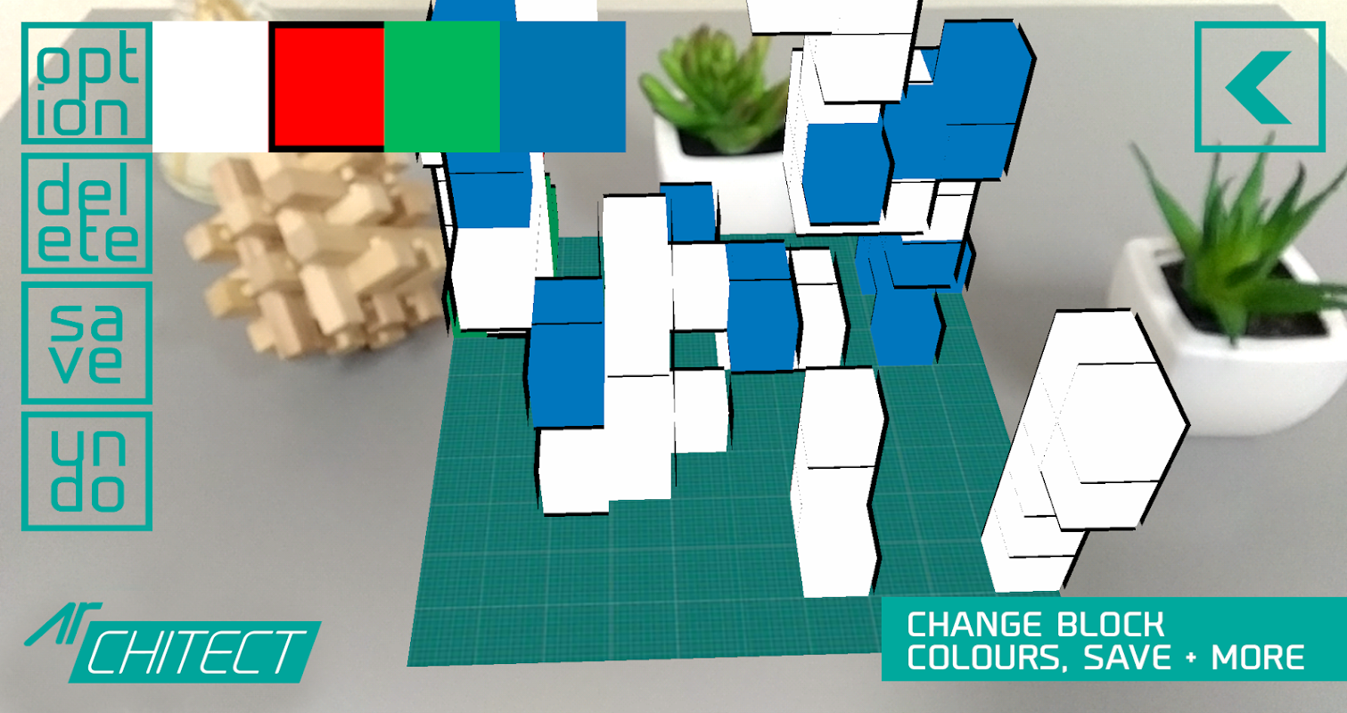 AR CHITECT is an augmented reality design app using cubes. Navigation is enabled using the respective mobile phone, allowing for an immersive experience. The colours of the cubes can be altered and the design achieved can be saved and loaded at will.